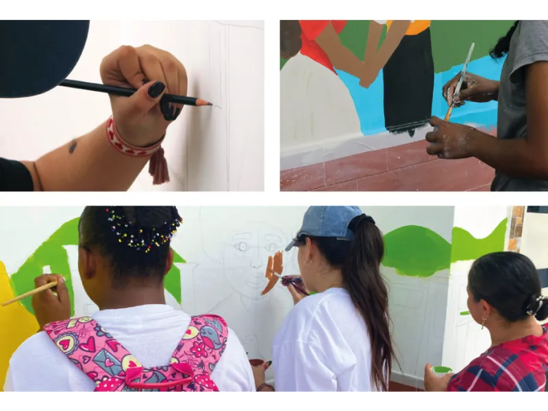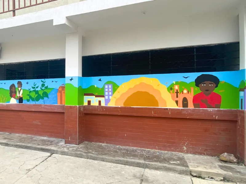 Finalmente, la segunda etapa del proyecto, con la que se cerró todo el trabajo comunitario en la institución, consistió en el diseño y la elaboración conjunta de un mural, creado con la participación de la comunidad. Más allá de embellecer el colegio, el propósito era claro: plasmar en la pared todo el legado y la identidad territorial narrados en los libros ilustrados.